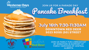 Join us in downtown Red Deer (5023 Ross (50) Street – Downtown Market site) for a free community pancake breakfast in celebration of Westerner Days and in support of Family Services of Central Alberta.