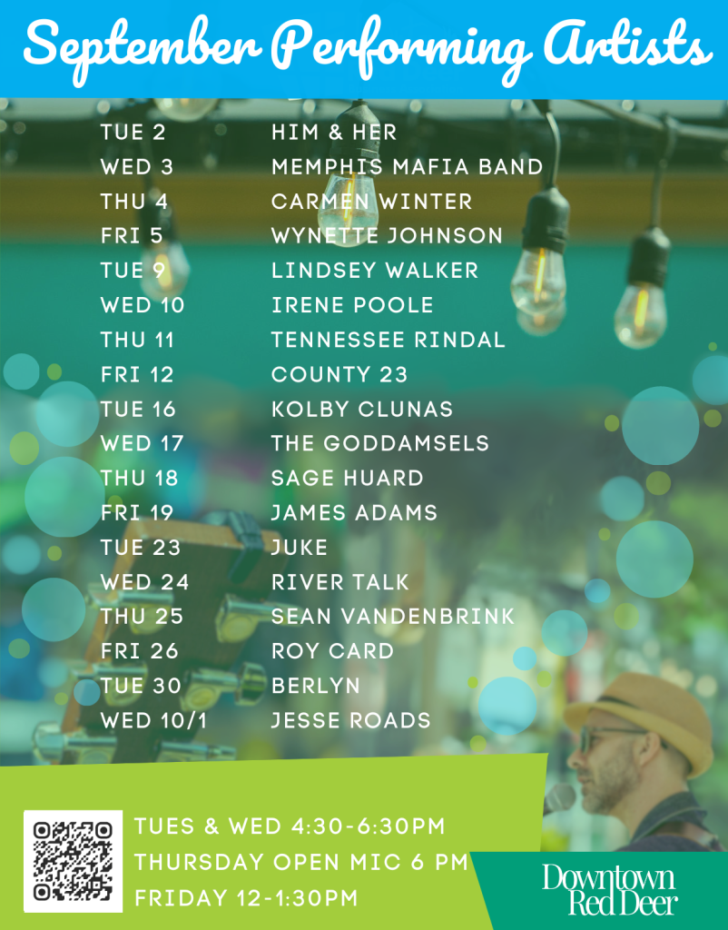 A partnership between The City of Red Deer and the Downtown Business Association (DBA), the Patio features free, live music for the Summer and early Fall seasons. We proudly feature talented local musicians and bands that contribute to the amazing atmosphere you’ll find on the beloved Patio. Events are free and open to the public.